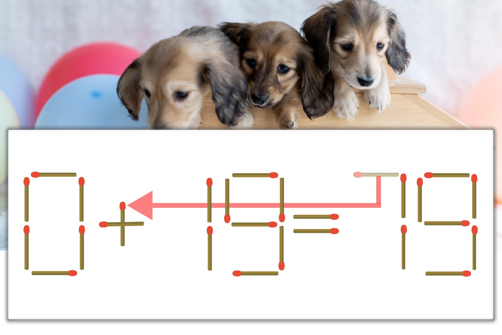 「7」を別の数字に変化させると答えが導き出せます。「7」のマッチ棒を1本移動して、「-」を「+」にしてみましょう。すると、「0+19=19」が成立します。