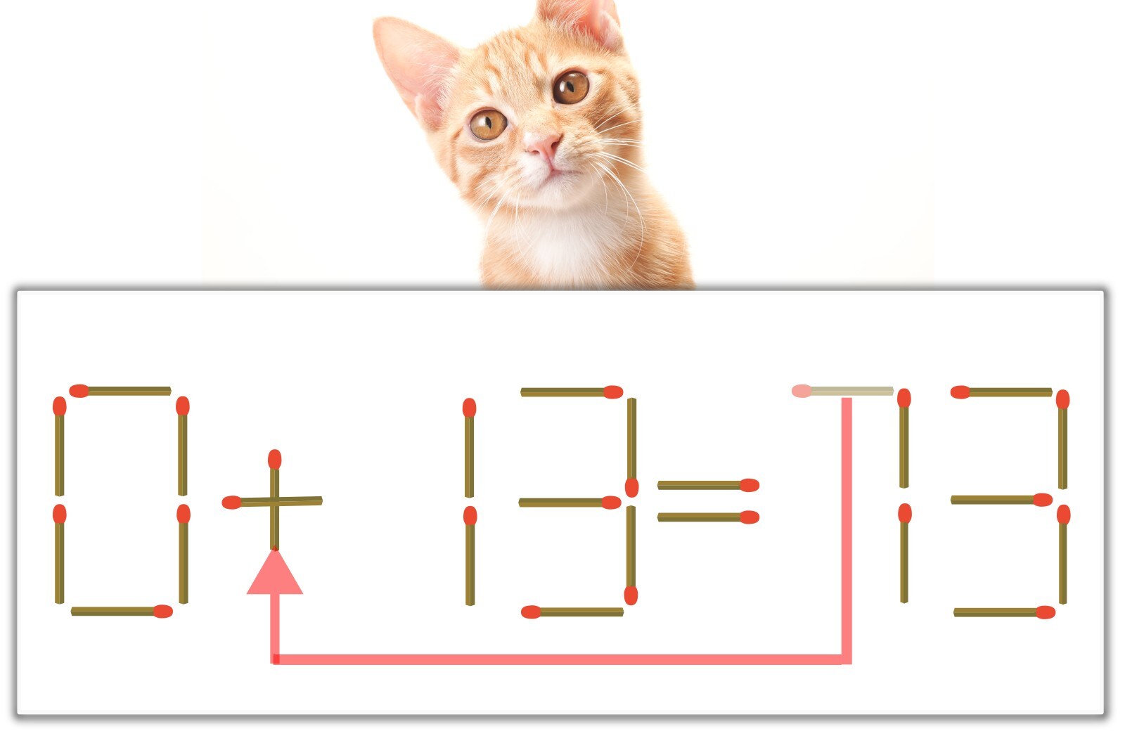 「7」を別の数字に変化させると答えが導き出せます。「7」のマッチ棒を1本移動して、「-」を「+」にしてみましょう。すると、「0+13=13」が成立します。