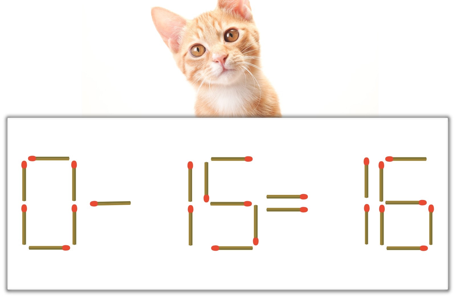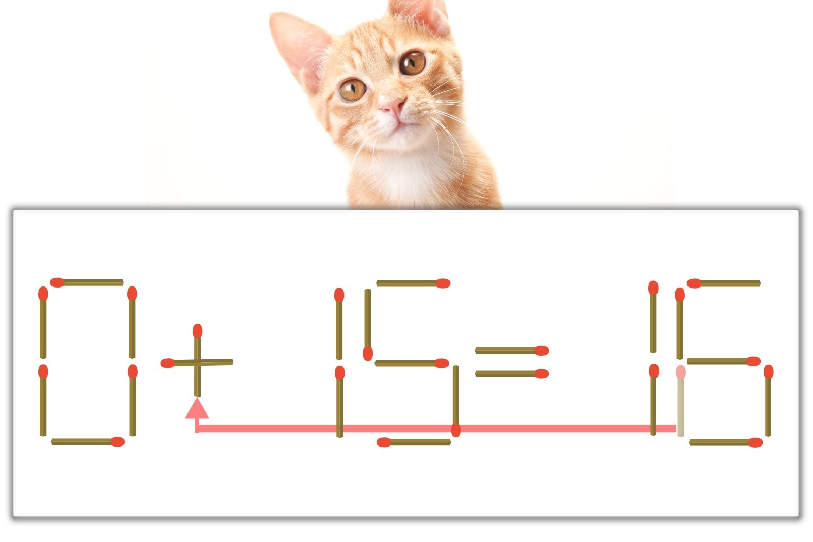 「6」を別の数字に変化させると答えが導き出せます。「6」のマッチ棒を1本移動して、「-」を「+」にしてみましょう。すると、「0+15=15」が成立します。