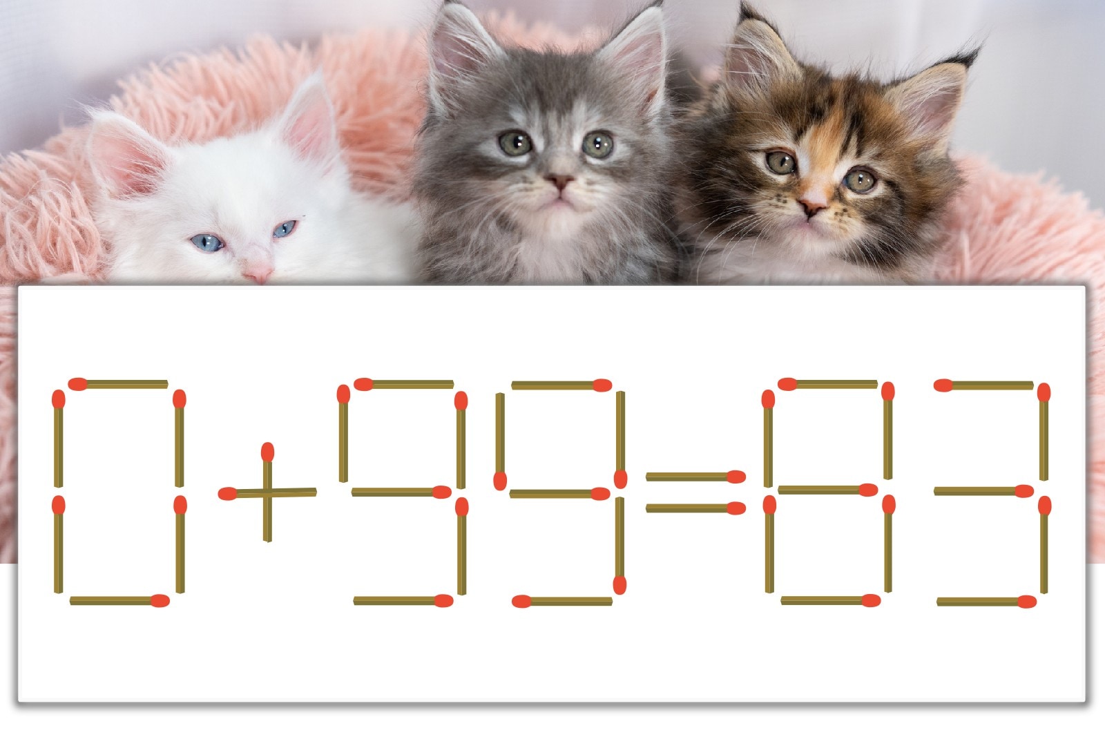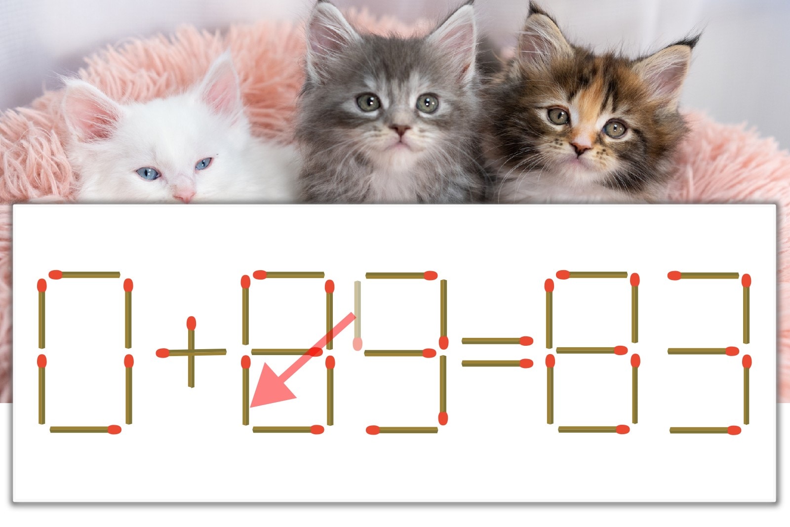 「9」を別の数字に変化させると答えが導き出せます。一の位の「9」のマッチ棒を1本移動して、十の位の「9」を「8」にしてみましょう。すると、「0+83=83」が成立します。