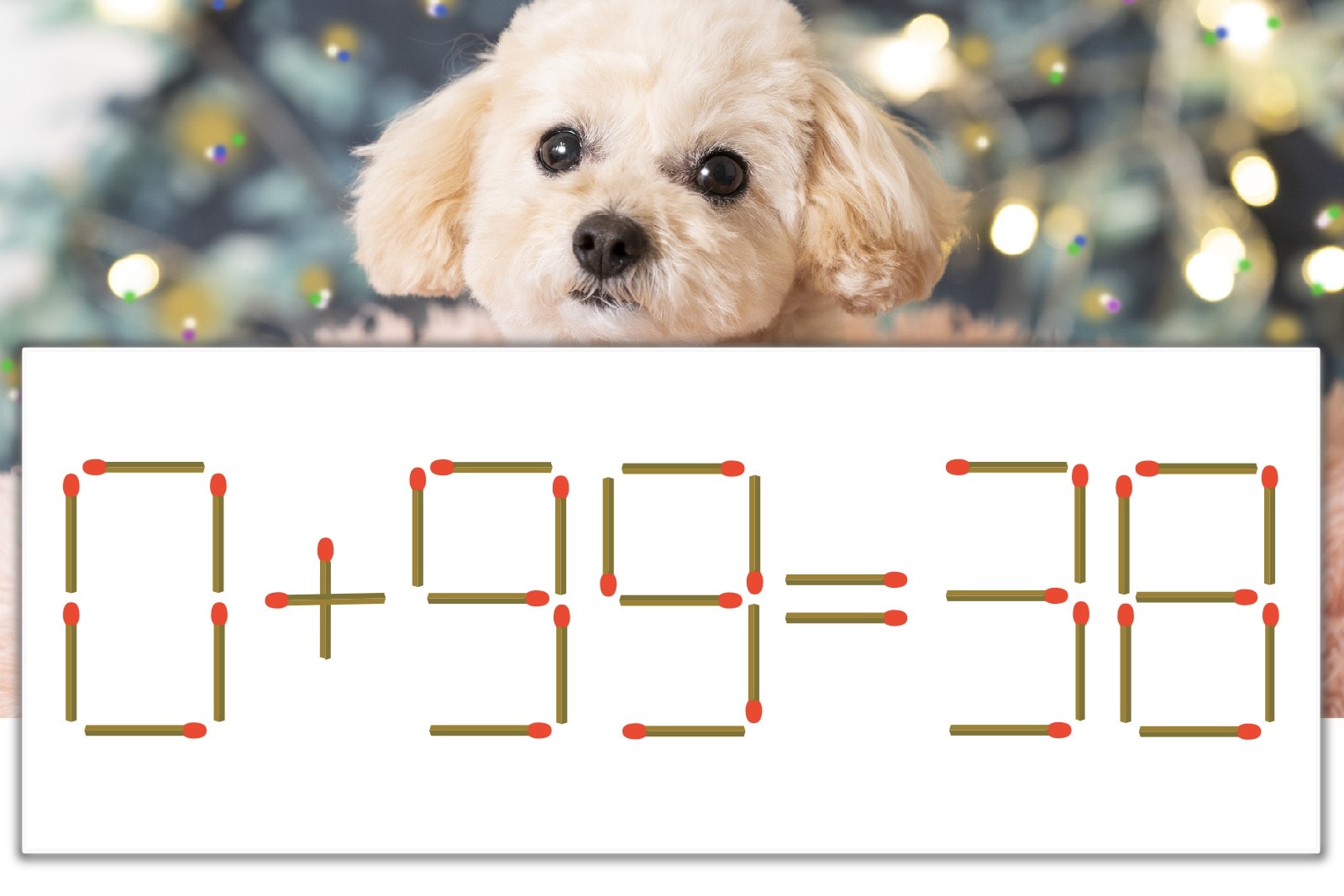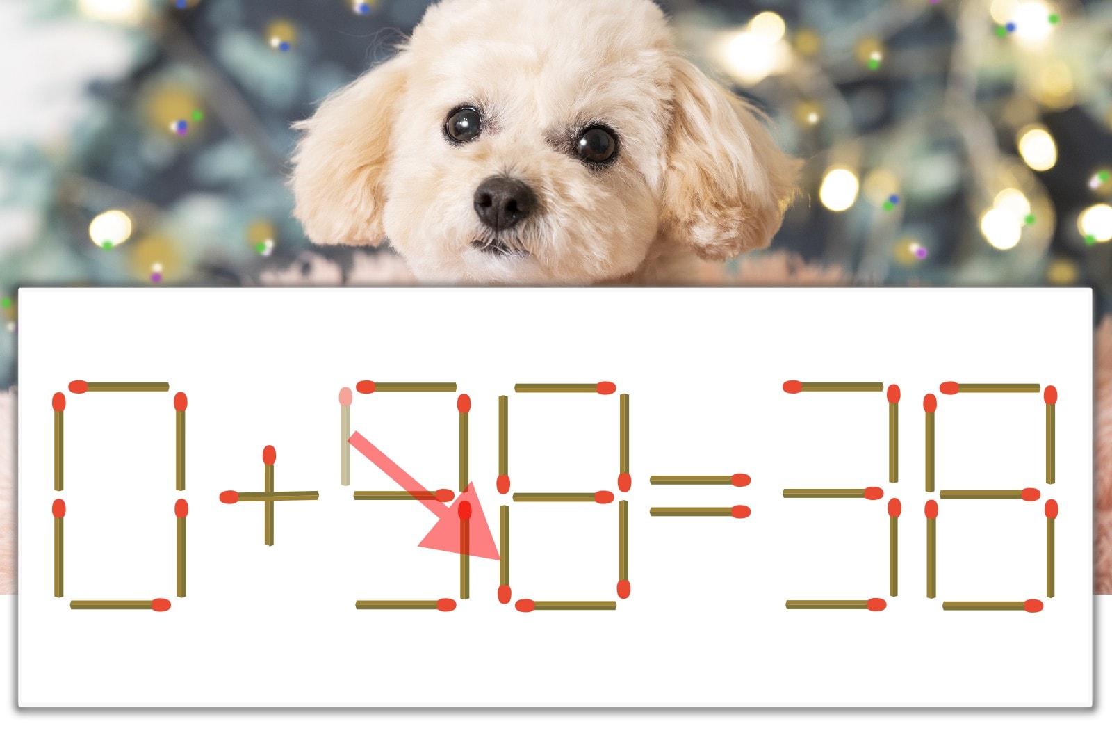 「9」を別の数字に変化させると答えが導き出せます。十の位の「9」のマッチ棒を1本移動して、一の位の「9」を「8」にしてみましょう。すると、「0+38=38」が成立します。