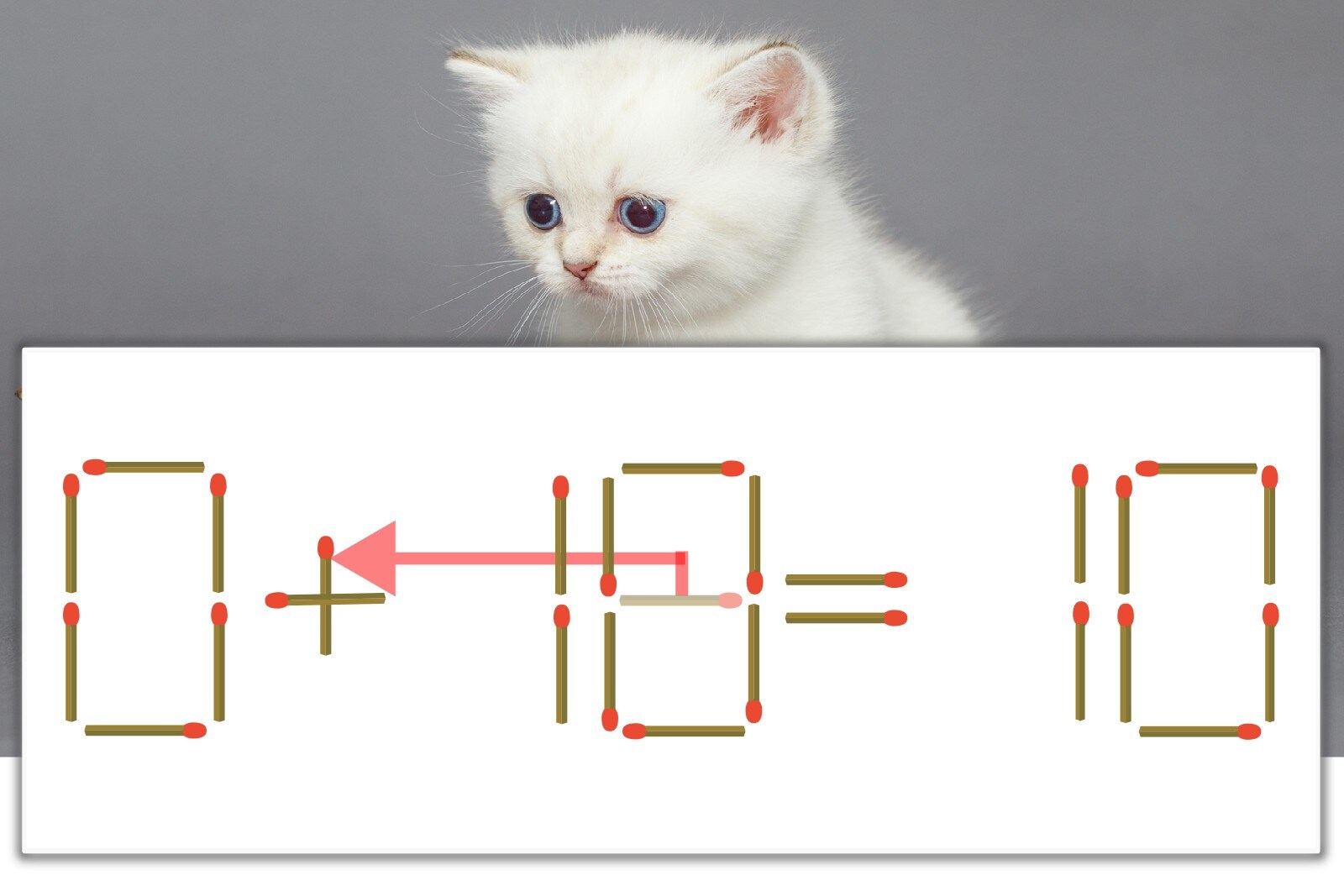 「8」を別の数字に変化させると答えが導き出せます。「8」のマッチ棒を1本移動して、「-」を「+」にしてみましょう。すると、「0+10=10」が成立します。