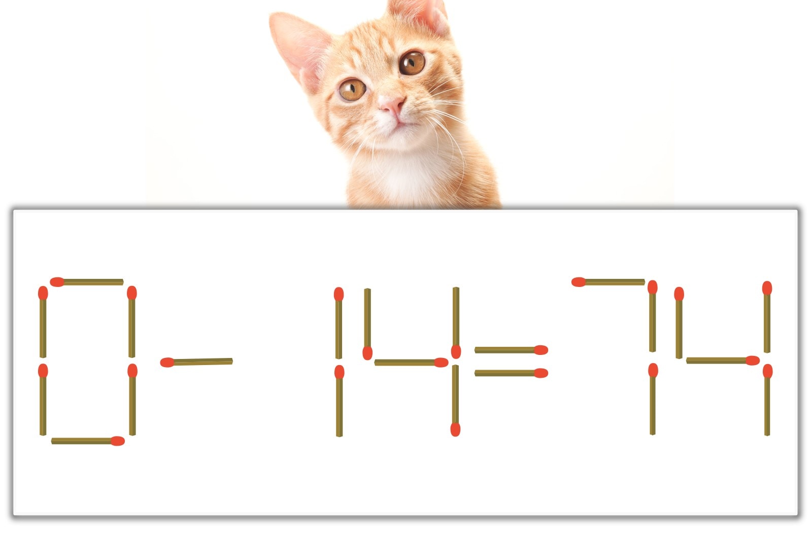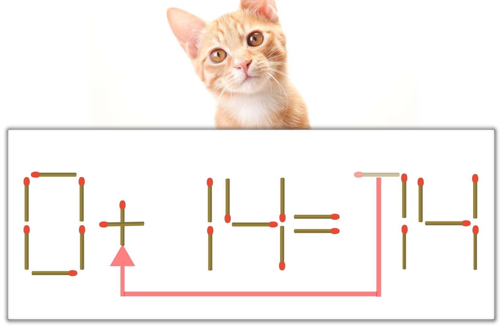 「7」を別の数字に変化させると答えが導き出せます。「7」のマッチ棒を1本移動して、「-」を「+」にしてみましょう。すると、「0+14=14」が成立します。