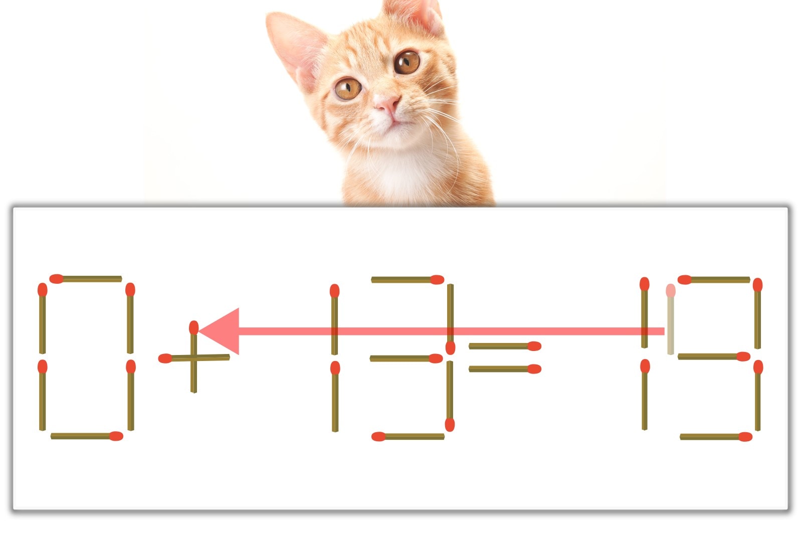「9」を別の数字に変化させると答えが導き出せます。「9」のマッチ棒を1本移動して、「-」を「+」にしてみましょう。すると、「0+13=13」が成立します。