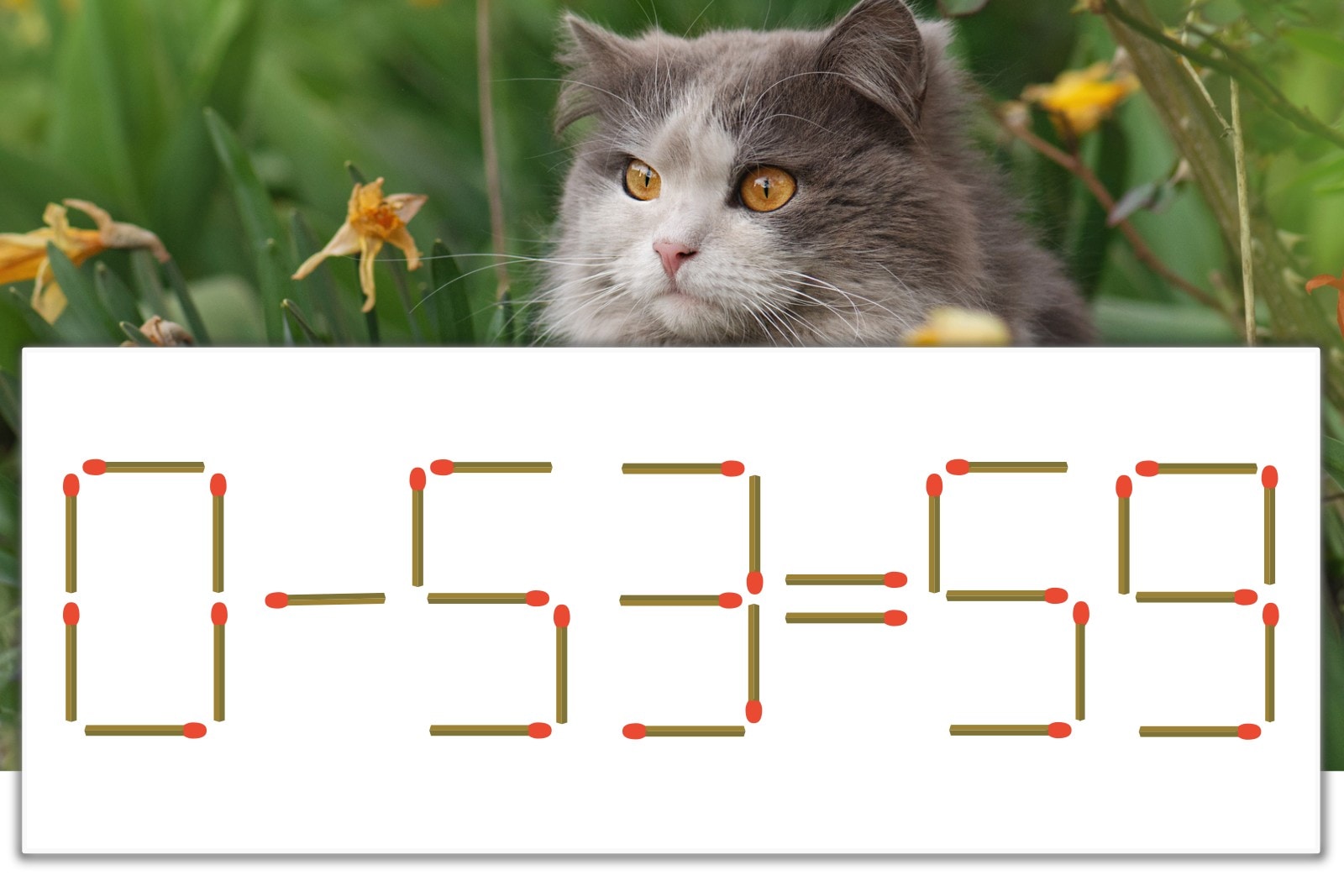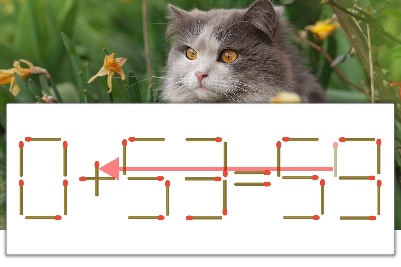 「9」を別の数字に変化させると答えが導き出せます。「9」のマッチ棒を1本移動して、「-」を「+」にしてみましょう。すると、「0+53=53」が成立します。