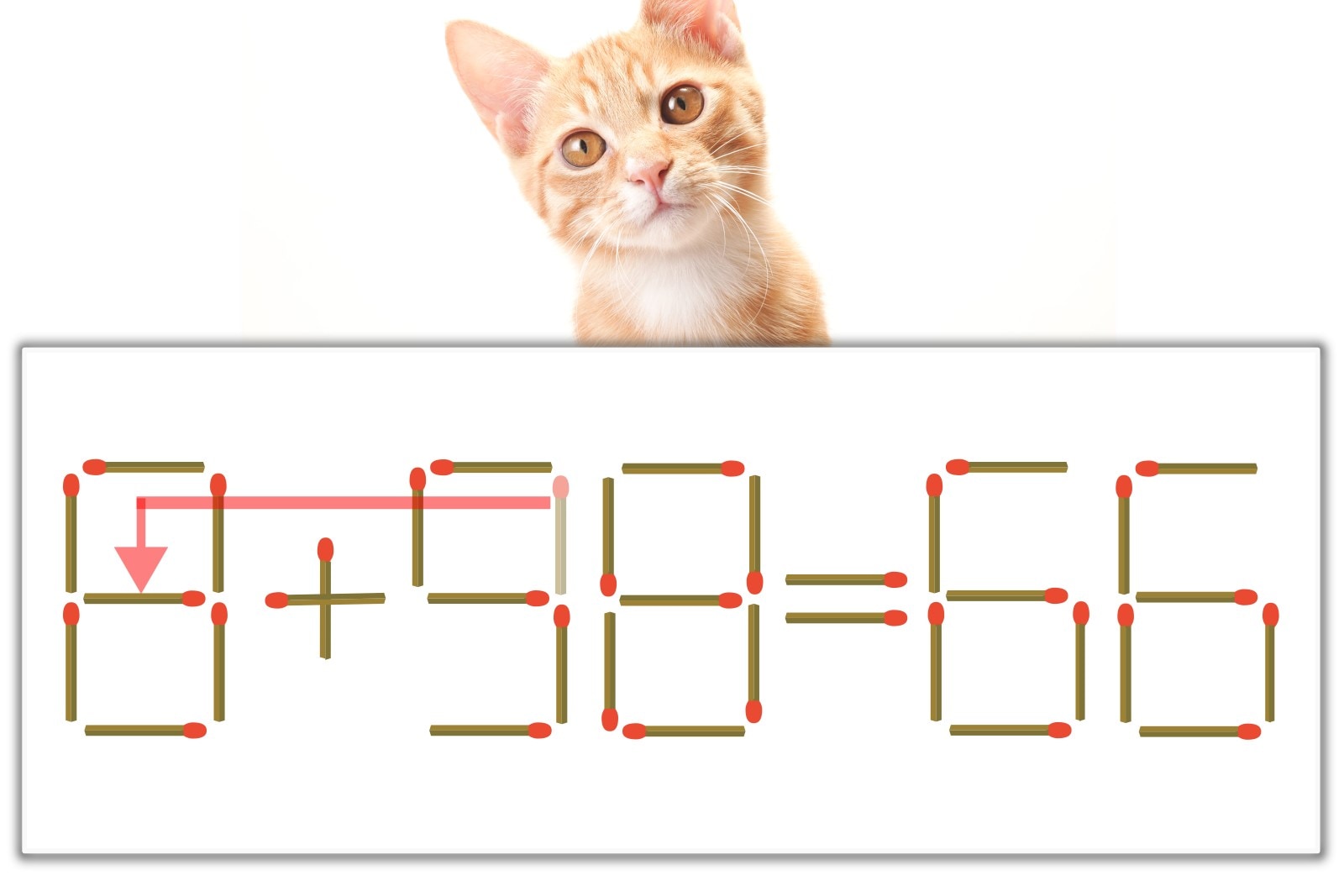 「9」を別の数字に変化させると答えが導き出せます。「9」のマッチ棒を1本移動して、「0」を「8」にしてみましょう。すると、「8+58=66」が成立します。
