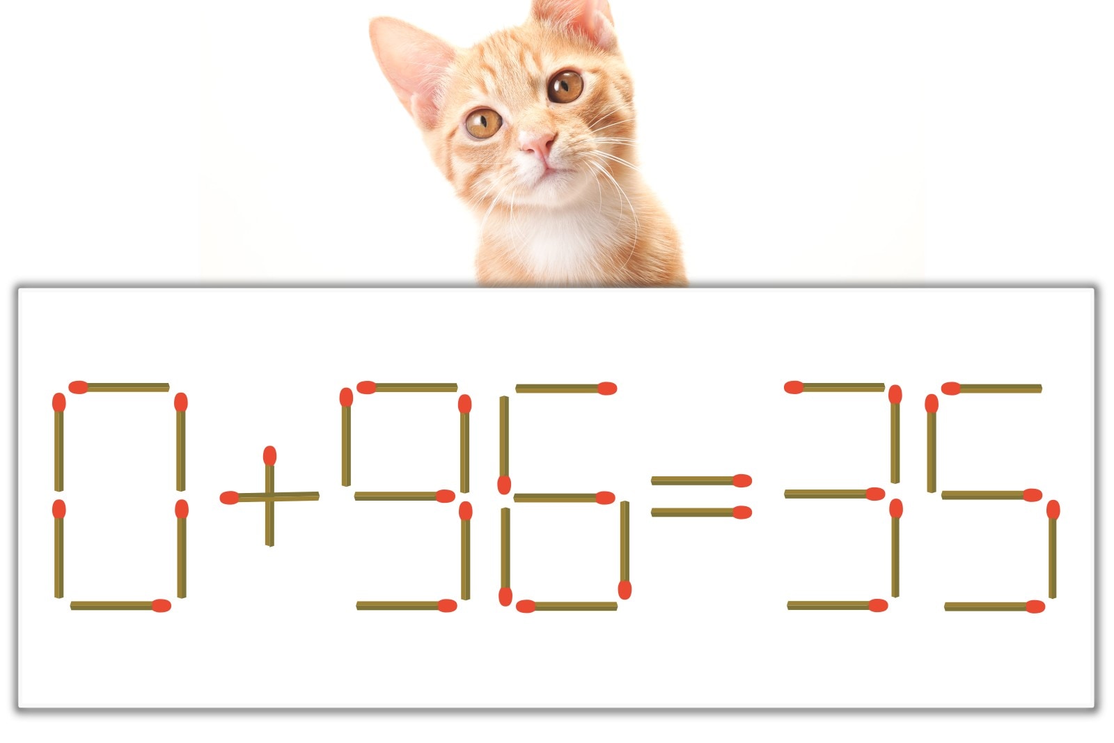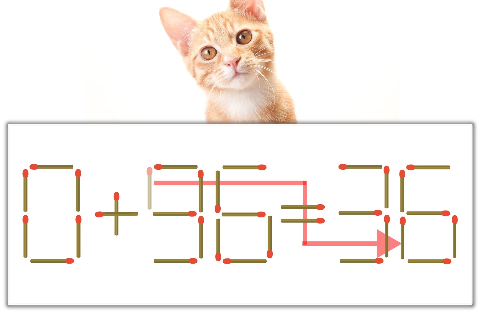 「9」を別の数字に変化させると答えが導き出せます。9のマッチ棒を1本移動させて、「5」を「6」にしてみましょう。すると、「0+36=36」が成立します。