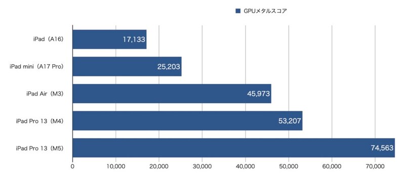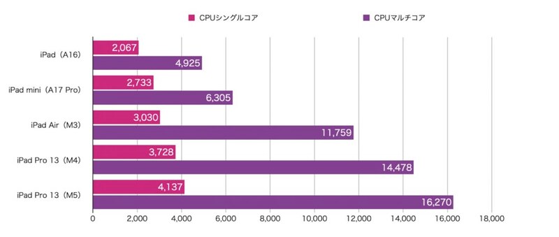 同じiPadでも、小学校などでも使われるiPad(A16)と、iPad Pro(M5)にはここまでの差があるのかと思うとちょっと驚く。しかし、iPad(A16)でも日常使用にはまったく不足がないのだから、いかにM5に高い性能が奢られているかよくわかる。