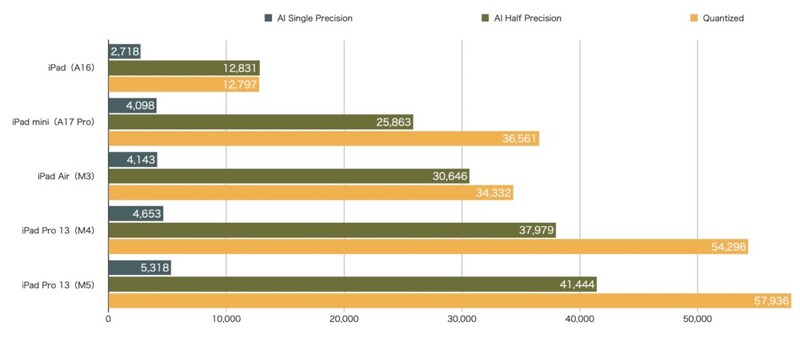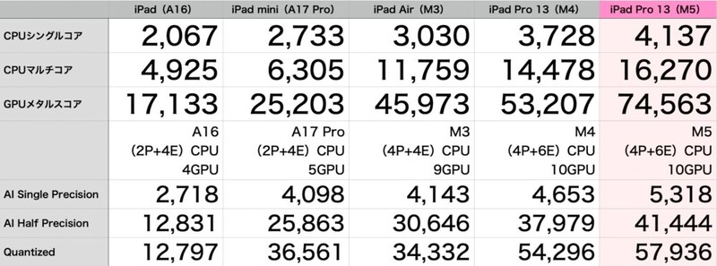ここでは、特に量子化の数値において、M4とM5が群を抜いていることがよくわかる。この2モデルがApple Intelligenceが発表されてから発売されたので、やはりAIのニーズが明確になってから、Neural Engineの開発により力を入れたということなのだろう。ここでも、iPad Pro(M5)の性能の高さは際立っている。