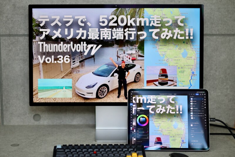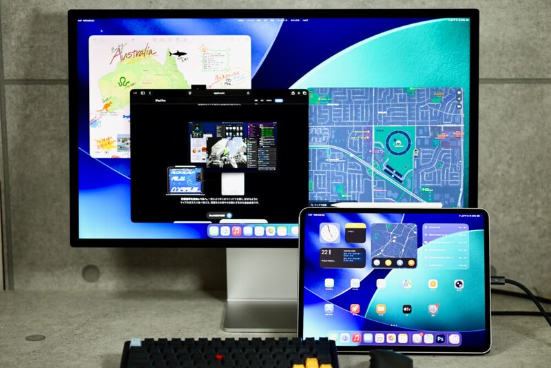 現行iPadは外部ディスプレイをサポートしているので、Studio Displayに繋いでみた。この状態では、キーボードとマウスが必要になる。