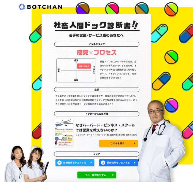 問診を通じて得たユーザーの思考や行動のパターン、職種などをもとに、そのユーザーのビジネスタイプを無料で診断。タイプに応じたアドバイスや、おすすめの書籍を処方します。