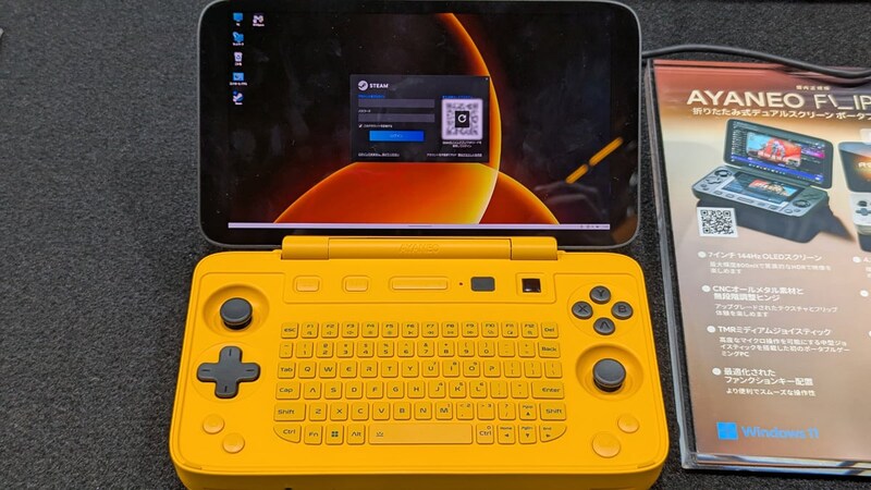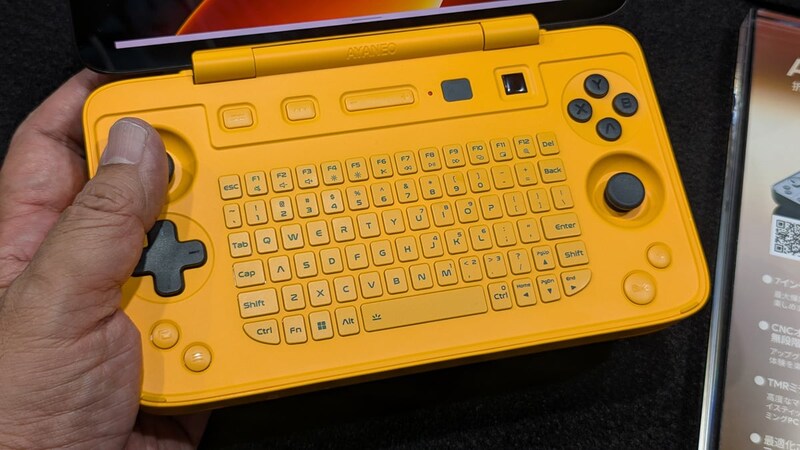 個人的に気になったのが、サブディスプレイの代わりに物理キーボードを搭載する「AYANEO FLIP 1S KB」。両手持ちで打ちやすそうな物理キーボードに、ABXYボタンの左上には光学マウスを搭載。外出先で立ったまま、ゲームにも仕事にも活躍しそうなポテンシャルを感じます。Indiegogoで予約受付中で、AMD Ryzen AI 9 HX 370と32GB RAM、1TBストレージの構成で1万40香港ドル(約19万6000円)のコースが公開されています。