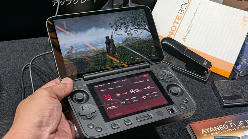 AYANEOブースでは、やはり2画面搭載でメインディスプレイを開閉できるフリップ式Windowsゲーム機「AYANEO FLIP 1S DS」を出展。144Hzで800nitの7インチOLEDメインディスプレイと4.5インチサブディスプレイを搭載。CPUはAMD Ryzen AI 9 HX 370とAMD Ryzen 7 8840Uが選択できます。メインディスプレイで「エルデンリング」をプレイしながら、サブディスプレイでパフォーマンスの監視や設定をする、という内容で展示されていましたが、コントローラーは操作感がよく、36FPSで滑らかに動作していました。現在天空がAmazonで予約受付中で、AMD Ryzen 7 8840Uと16GB RAM、1TBストレージの構成が15万9600円(税込)。