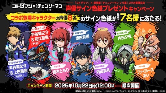 株式会社MIXI(東京都渋谷区、代表取締役社長 上級執行役員 CEO:木村 弘毅)は、スマホアプリの「ことば」で闘う新感覚RPG「共闘ことばRPG コトダマン」(以下コトダマン)において、劇場版『チェンソーマン レゼ篇』とのコラボを、本年10月24日(金)より開催します。