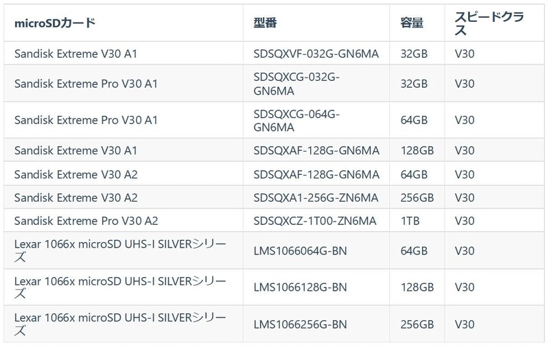 公式は、Insta360公式ストアで販売されている純正microSDカードの使用を推奨している。そのうえで、以下のSanDiskのSDカードでも動作確認ができているという。
