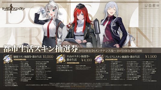 「9月19日(金)メンテナンス後」より、人形達が街やオフィスなど日常になじんだスキンが入手できる「都市生活スキン抽選券」を期間限定で3種類発売いたします。