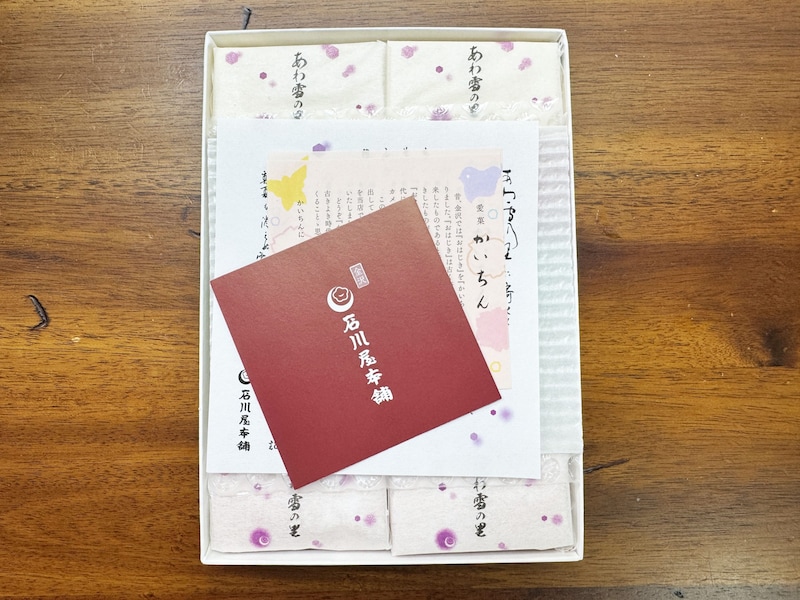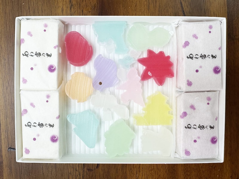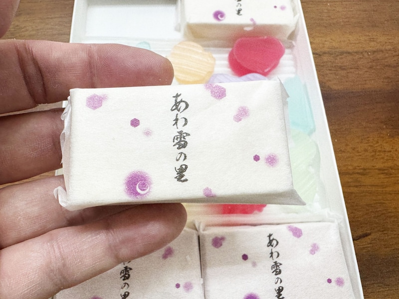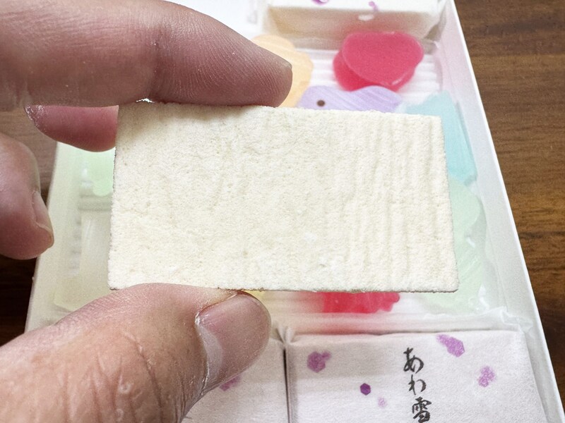 2025年10月に届いたものは、石川屋本舗の「かいちん」(琥珀糖)と「あわ雪の里」でした。「かいちん」はカラフルなお菓子で、透明感があって、観ているだけで心がなごみます。飴のように見えますが、表面は硬く、内部はトロリとした食感で、優しい甘味が広がります。とっても不思議な和菓子です。
