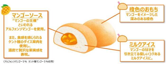 クリーミーで軽い口どけのアイスに、濃厚で熟したマンゴーの味わいを再現したソース、さらに食感を楽しめるケント種のダイス果肉を組み合わせています。
