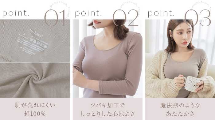 冬の乾燥や肌荒れに悩む女性におすすめなのが、tu-hacciの「コットンインナー」。綿100%素材で、敏感な肌を優しく包み込み、1日中心地よい着心地が続きます。