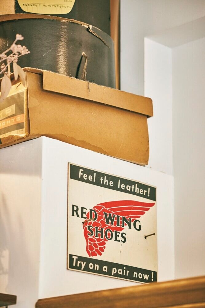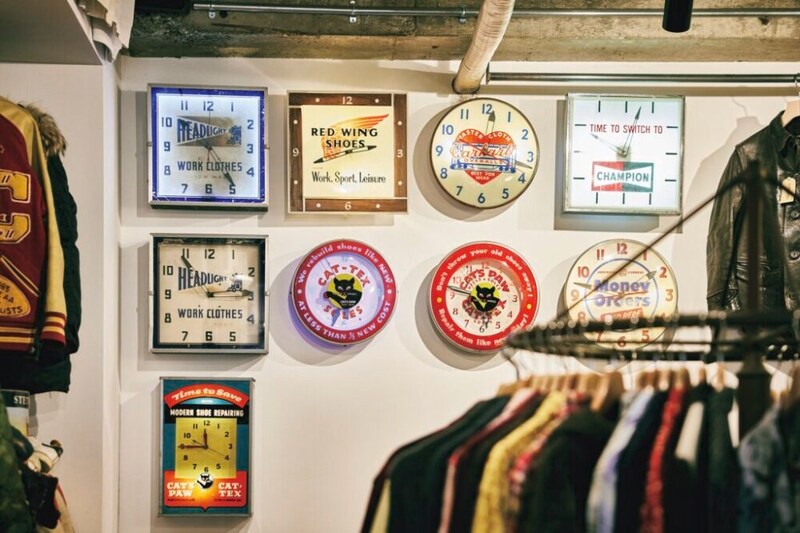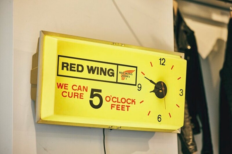 RED WING好きはブーツだけに限らず、古着市場ではなかなか出回ることが少ないとされているヴィンテージの壁掛け時計(完動品)や当時の販売促進物として流通していたバナーなどもコレクションしており、一部ショップの壁面に飾られている。