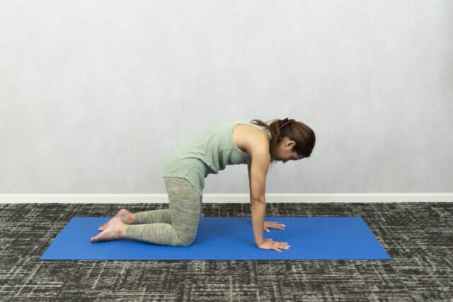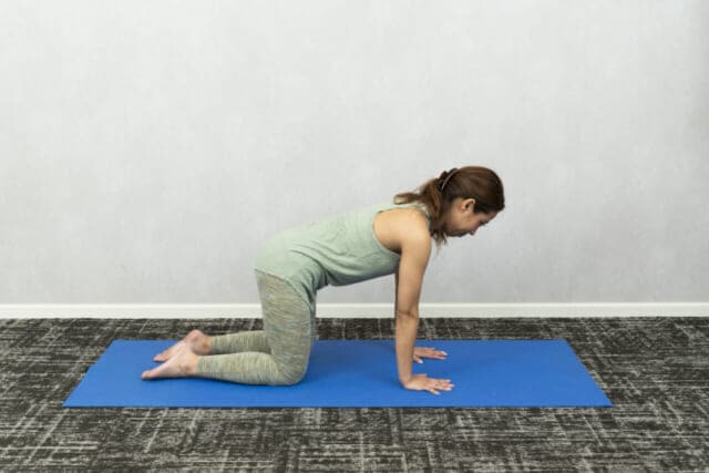 (3)息を吐きながらおへそを見るように骨盤を後ろに傾け、背中を丸める
