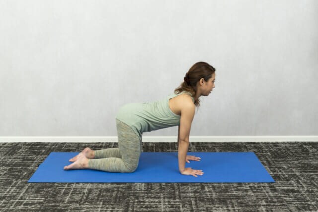 (2)息を吸いながら尾骨を天井に向けるように動かし、背中を反らす