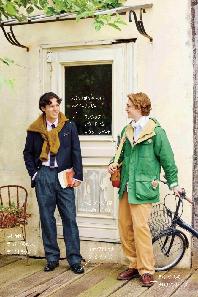 【左】トラウザーズ2万2000円/エドウイン(エドウインTEL0120-008-503)、ブレザー6万9300円、BDシャツ1万6500円、肩に巻いたシャギードッグセーター3万3000円/すべてJ.プレス オリジナルス(J.プレス & サンズ 青山TEL03-6805-0315)、ニットタイ1万8700円(グラストンベリーショールームTEL03-6231-0213)、シューズ6万8200円/サンダース(サンダースジャパンTEL03-6231-0115)、ポケットに入れたメガネ4万9500円/ジュリアス・タート・オプティカル(G.B.ガファスTEL03-6427-6989)