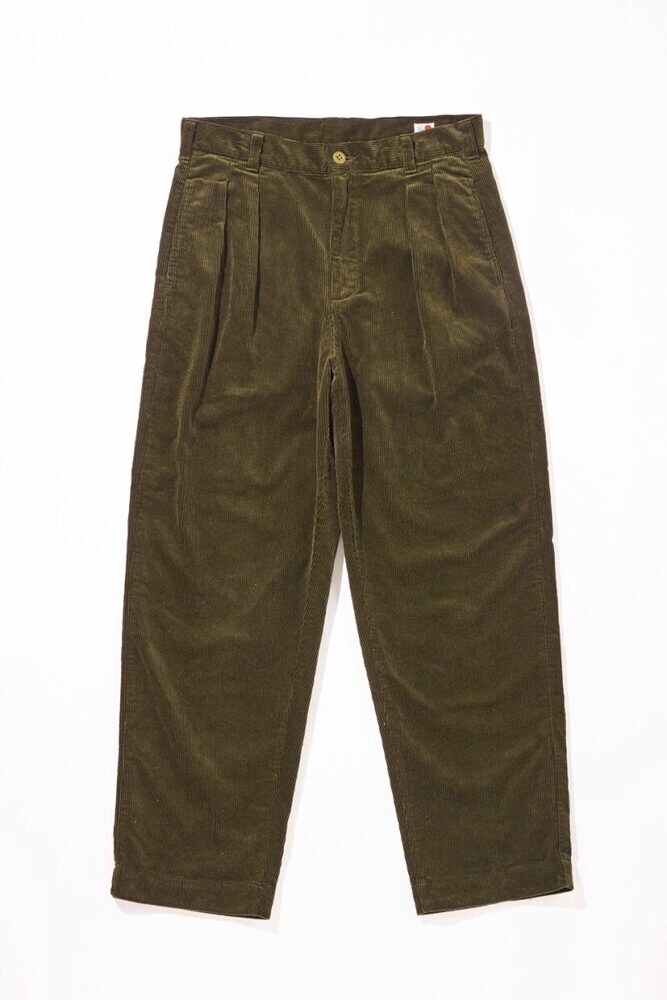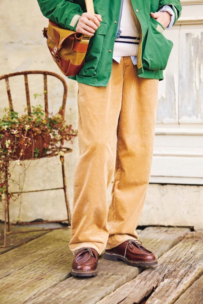 ジャパニーズアイビーの流行がひと段落した70年代に生まれたヘビーデューティアイビーは、文字通り由緒正しきアイビールックを軸に、アウトドアやスポーツを出自とするヘビーデューティ(=頑丈な)なアイテムを組み合わせたスタイル。その定番のボトムスに挙げられるのがコーデュロイパンツだ。シルエットやディテールは、上のデニムトラウザーズと同様。素材は9W(ウェル、1インチの幅に9つの畝があるの意)のコーデュロイを採用。9Wは中畝に分類され、光沢や存在感が強すぎないことからコーディネイトに取り入れやすいのが特徴だ。デニムと同じく国内工場で縫製されており、毛羽立たせることで温かみのある表情に仕上げている。2万2000円