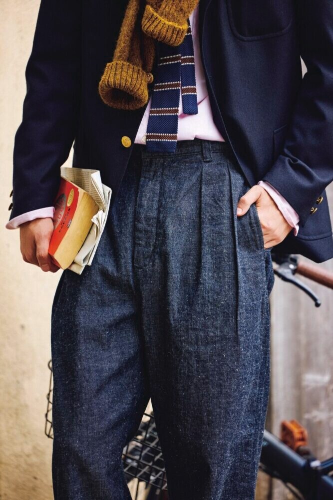 正統派なアイビールックにはネップ感のあるデニムトラウザーズを