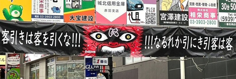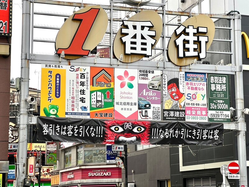 東京都北区赤羽の商店街「赤羽一番街」の入口に掲げられた横断幕が、インターネット上で話題となっている。あまりにも、あまりにも、奇妙、いや、奇天烈、いや、奇抜なのである。