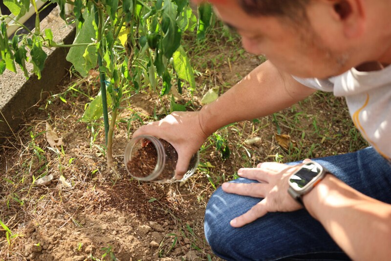 1週間したら、土に混ぜ込む。できることなら、別途土に混ぜ込んでさらに1週間ほど寝かせた方が生物分解は進むようだが、別に庭の土の中で分解されてもいいかと思いそのまま撒いた。プランターなどで土が限られているなら、やはり別途混ぜ込んで1週間ほど寝かせたものをプランターに入れた方がいいかもしれない。