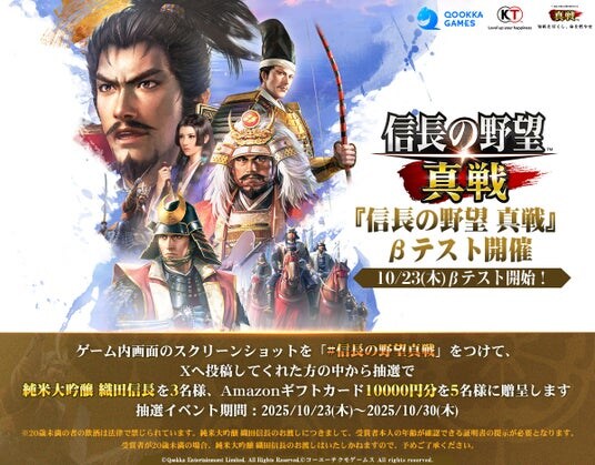 さらに、βテスト開催を記念して、公式X(旧Twitter)@nobunagashinsenにて、最大10,000円分のAmazonギフトカードが当たるキャンペーンを開催!このチャンスをお見逃しなく!