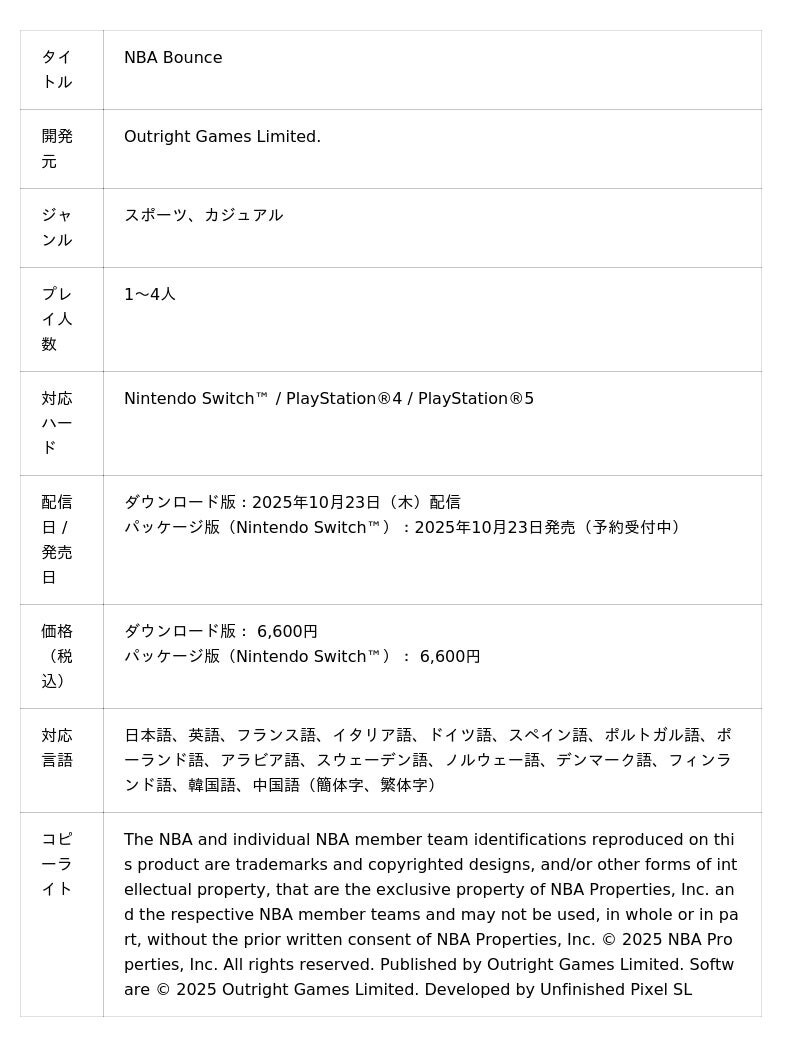 株式会社Phoenixx(フィーニックス)(東京都武蔵野市、代表取締役社長:坂本 和則)は、スポーツゲーム『NBA Bounce』について、本日2025年10月23日(木)よりNintendo Switch(TM) / PlayStation(R)️4 / PlayStation(R)️5向けに、販売開始することをお知らせいたします。