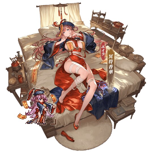 心優しき神使エイラが、東洋の神秘的な幽玄を纏い登場。 鮮烈な朱と藍のチャイナドレスを思わせる装束を、霊符と香華が彩ります。艶やかな衣装と、どこか物憂げな眼差しは、現世と幽世の境界線に佇むかのような儚い色香を感じさせます。