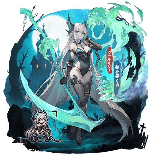 主人公ヴァルキリーのもう一つのハロウィン装いは、死神の鎌を携えた「魂を導く者」。冥府の王を思わせる漆黒の装甲と、大きくたなびくゴーストの影が、彼女の周囲に威圧的な力を漂わせます。