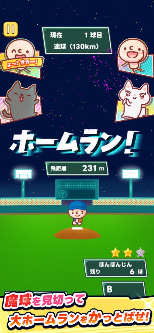 本作は、様々な「魔球」を攻略してホームランを打つ爽快なバッティングゲームです。