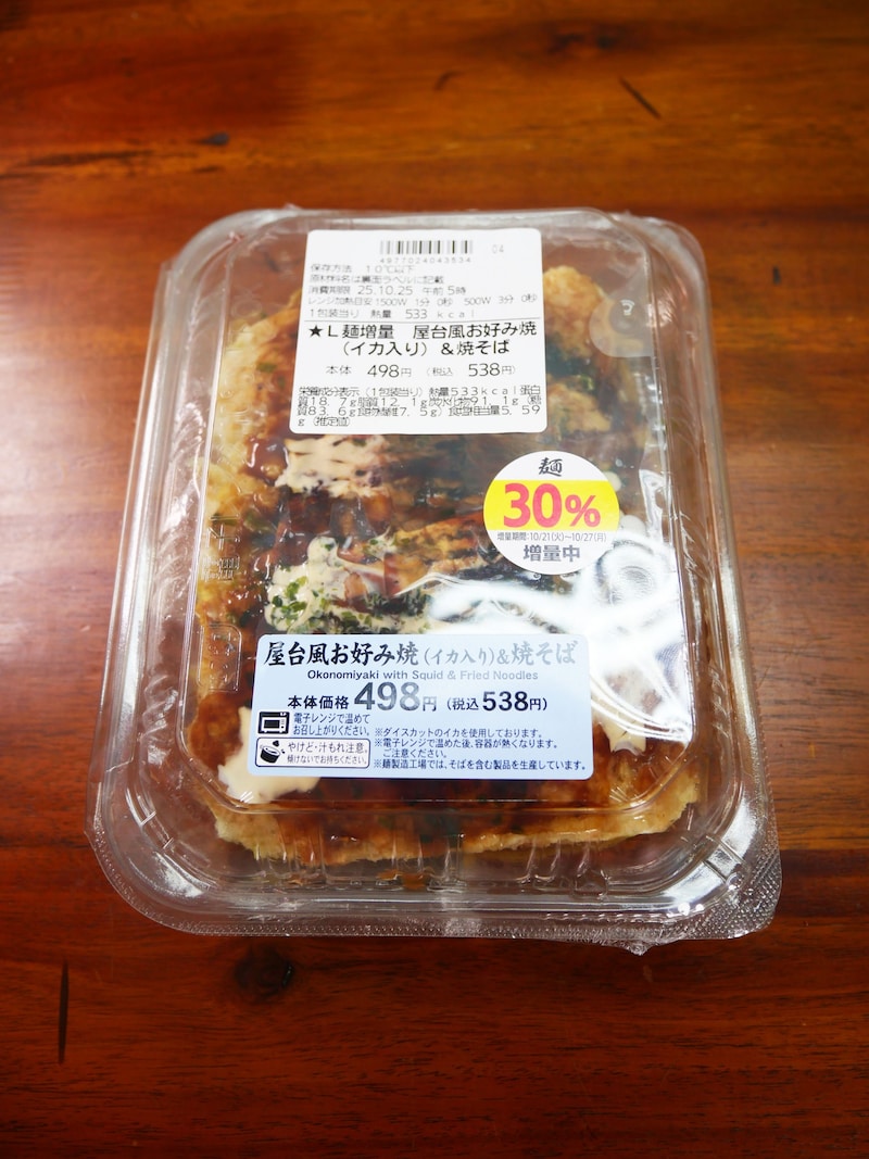 まあ、気になる点があるとすれば、商品名の「(イカ入り)」の位置ぐらい。「屋台風イカ入りお好み焼&焼そば」「屋台風イカ入りお好み焼&焼そば」のほうがスッキリするかも!! ほかは完璧。いや、イカ入りはお好み焼きだけという点を、しっかり強調したかったのか。どうなのか。だとしても「屋台風イカ入りお好み焼&焼そば」が良いかも。どうか。