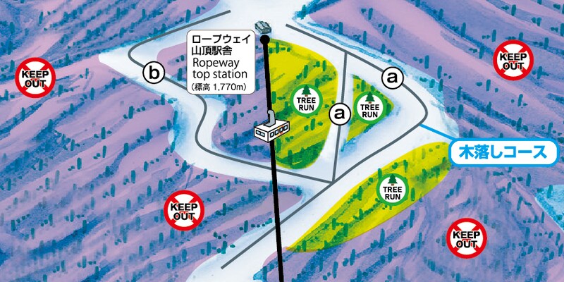 そんな竜王に今シーズン、待望のツリーランエリアが誕生する。ゲレンデ中腹、ロープウェー山頂駅舎の直下に位置する3つのエリアから構成され、サラサラのパウダースノーを求めるフリークたちが集う、竜王名物「気落としコース」に隣接する。エリアの開放に伴い、コースの名称も「木落し Bowl」へと変更され、その名の通り、半円形状に広がる壮大な自然地形が楽しめる新スポットとして注目を集めている。