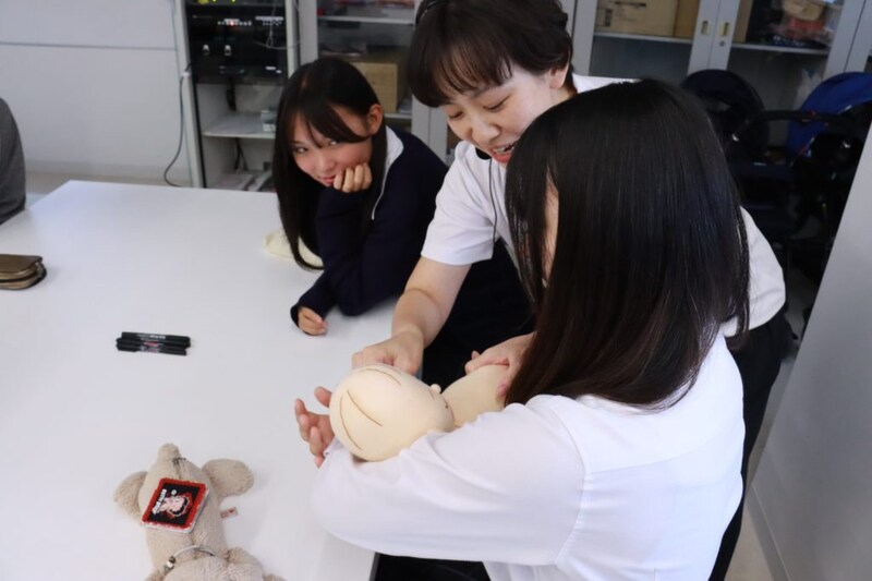おっかなびっくりと人形を抱く生徒たちに、ピジョンのスタッフが正しい抱き方を丁寧に教えていきました。