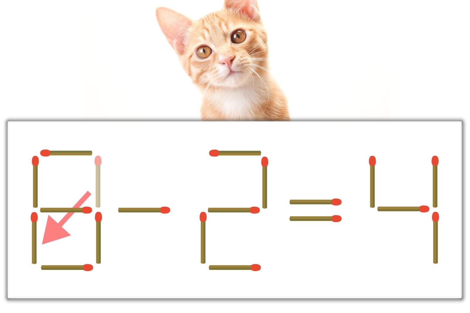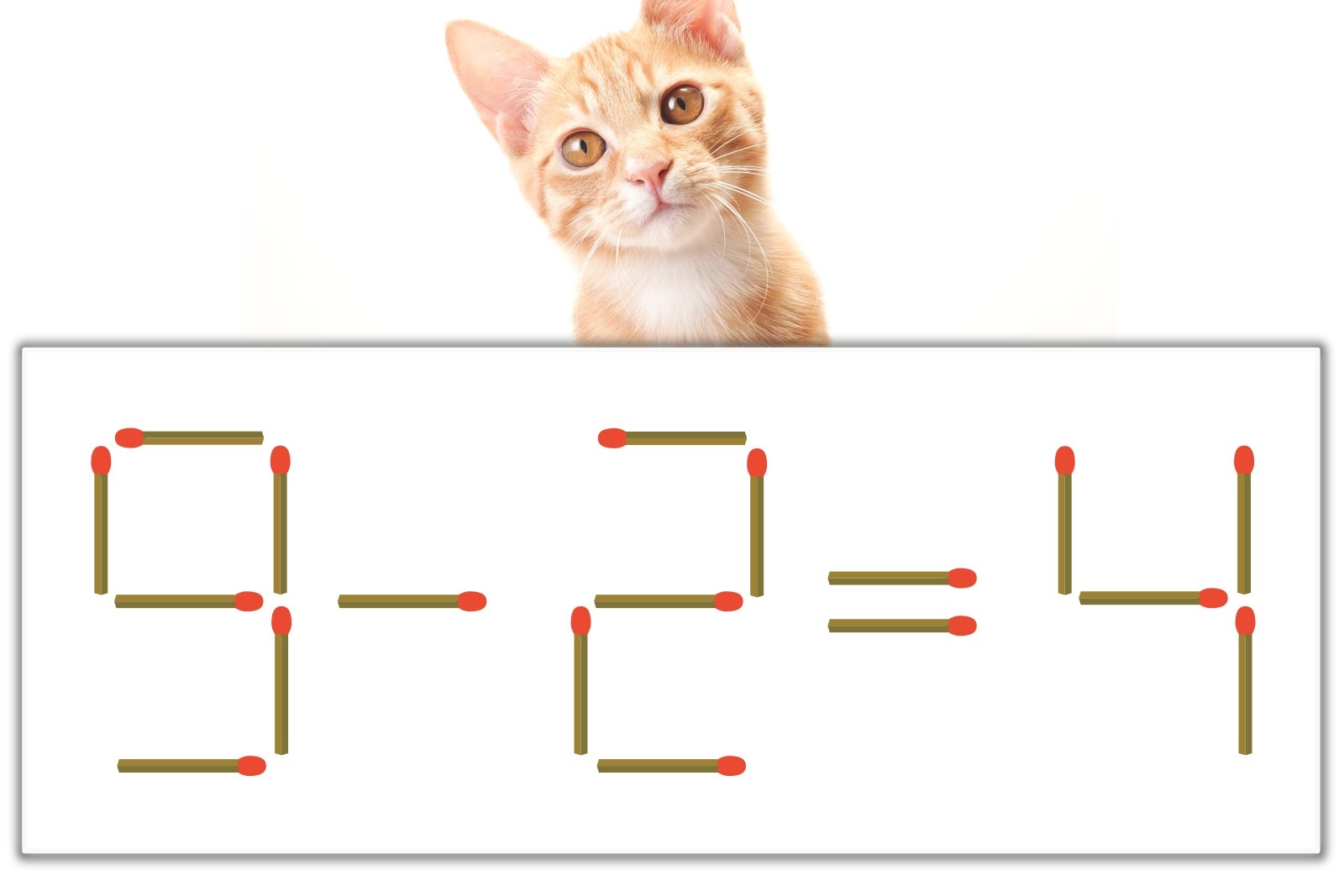 「9」のマッチ棒を1本、左下にスライドさせて「6」を作り、「6-2=4」にする。※解答は複数ある場合があります。