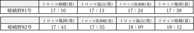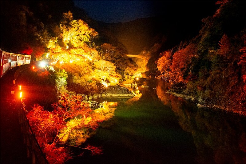 期間中は臨時列車も登場するほか、嵯峨野16号(トロッコ亀岡駅16:30発)以降はすべての列車でライトアップ・イルミネーションが楽しめます。