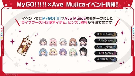 今回のイベントでは、イベント報酬としてMyGO!!!!!やAve Mujicaをモチーフとしたライブブースト回復アイテムやピンズ、称号などが登場いたします。