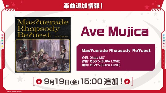 9月19日(金)15時に、Ave Mujicaのオリジナル楽曲『Mas?uerade Rhapsody Re?uest』の追加を予定しております。