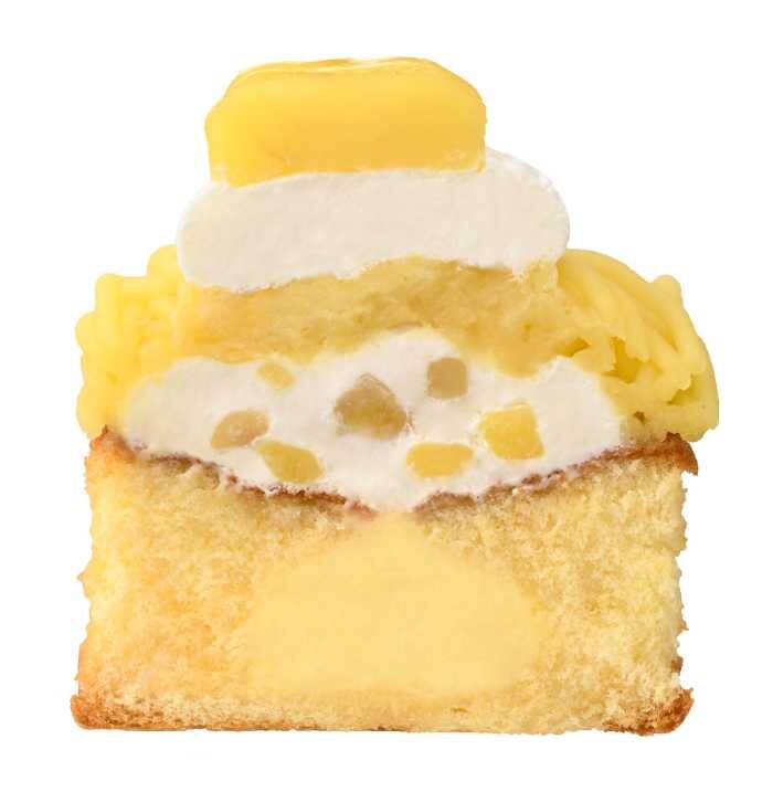 「モンブラン」(460円/税込496円)は、昔ながらの黄色い見た目が特徴。スポンジの中にはなめらかなカスタードが入り、マロンダイスとラム酒香るクリームを重ねています。