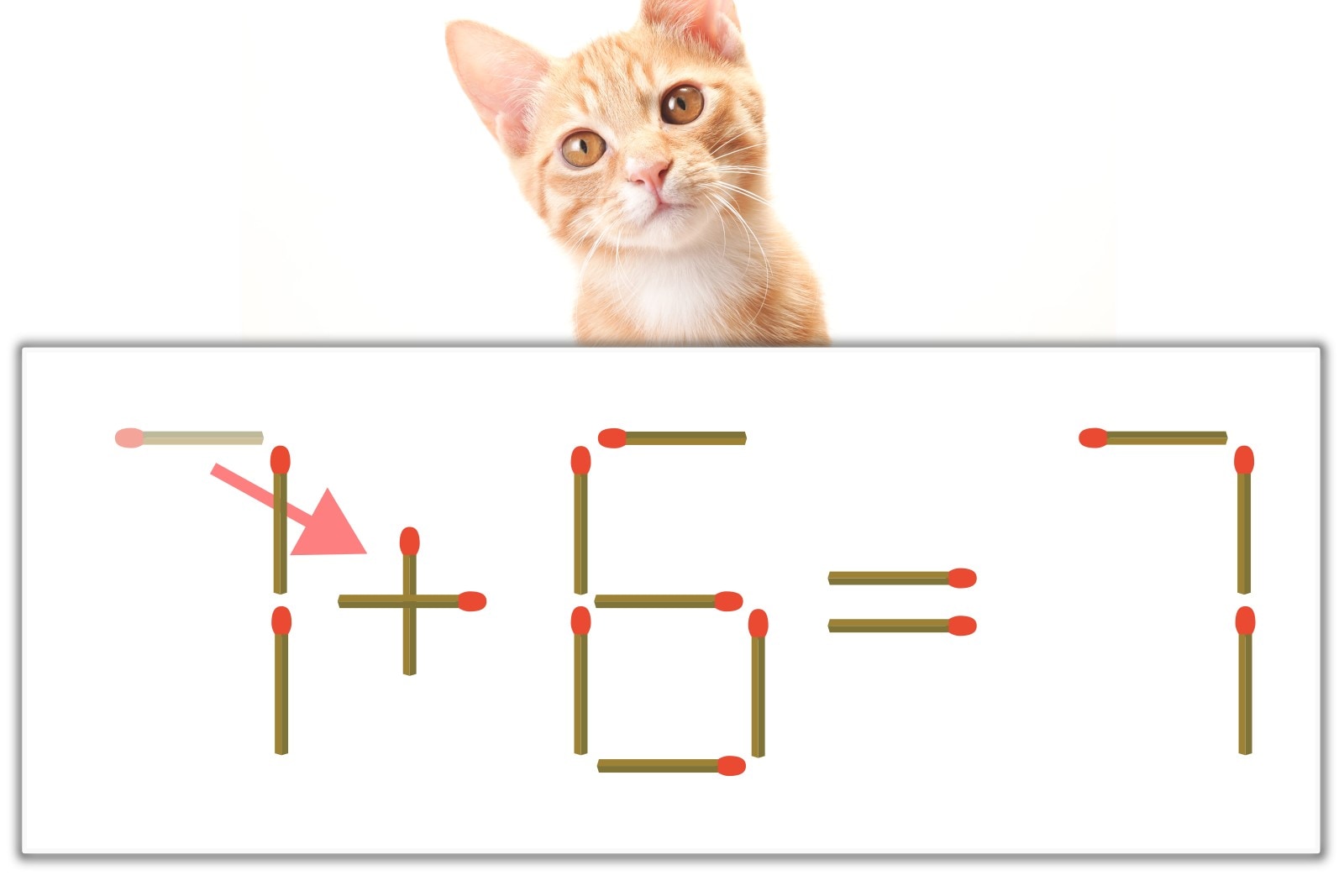 「7」のマッチ棒を1本、右にスライドさせて「+」を作り、「1+6=7」にする。※解答は複数ある場合があります。