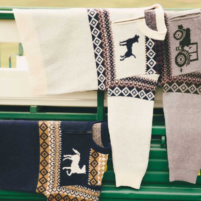 ジャガードZIPニットプルオーバー(8,000円税込)は、トラクターや動物をジャガード編みで表現。カラーはグレー/アイボリー/ネイビー、フリーサイズ。