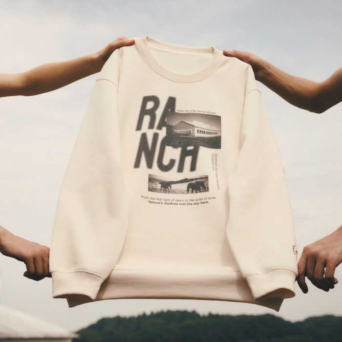 フォトスウェットプルオーバー(7,000円税込)は、実際に「NASU FARM VILLAGE」で撮影された写真を使用。カラーはチャコール/オートミール/アイボリー、サイズM/L展開。
