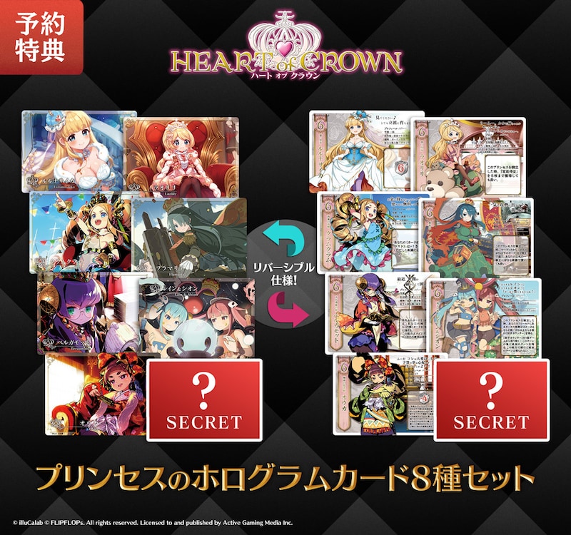 パッケージ版では店舗特典だけではなく、初回特典として実際のカードゲーム『HEART of CROWN』でも使用可能なプリセンス のホログラムカード 8 枚セットをご用意しておりますのでぜひご予約ください。