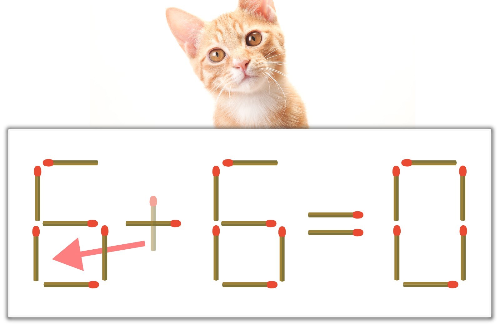 「+」のマッチ棒を1本、左にスライドさせて「6」を作り、「6-6=0」にする。※解答は複数ある場合があります。