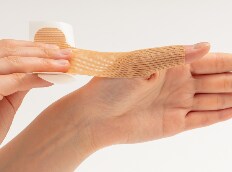 テープ素材も粘着剤も空気や水蒸気をよく通すので、蒸れにくくはがれにくい。貼ったまま水仕事も可能です。